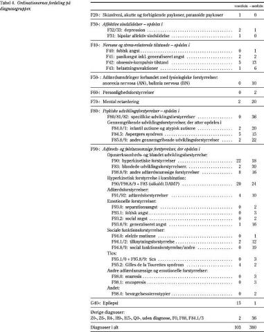 Anvendte diagnoser, såvel hoved- som bidiagnoser, blev klassificeret ud fra The International Classification of Diseases and Related Health Problems (ICD)-10 (F20-F90, G40, øvrige diagnoser [Z, R, H, Q, uden diagnose]).