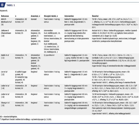 tiv optimering af disse patienters behandling. Vi har udelukkende medtaget randomiserede, kontrollerede studier, der omfatter kejsersnit samt laparoskopisk og åben gynækologisk kirurgi med tyggegummitygning postoperativt som intervention.