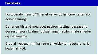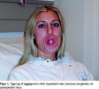 Postoperativ ileus (POI) er et tilbagevendende problem ved abdominalkirurgi til trods for, at der foreligger udbredt forskning på området. POI er typisk karakteriseret ved et forløb med kvalme, opkastninger, abdominale smerter, meteorisme, ændrede eller manglede tarmlyde samt forsinket afgang af flatus og fæces [1]. Der ses øget varighed af indlæggelsestid, idet tilbagevenden af tarmfunktionen typisk afventes inden udskrivelse. Flere studier, der omhandler det postoperative forløb viser, at den normale peristaltik efter laparotomi typisk vender tilbage inden for 24-48 timer i ventriklen, 12-24 timer i tyndtarmen og efter 3-5 dage i colon [2]. Der er udviklet forslag til accelererede patientforløb (fast track) primært for at reducere komplikationsraten efter operationen, dvs. for at gavne patienterne, men også med en sekundær gevinst i form af reduceret varighed af indlæggelsen. Et af de nyeste tiltag er studier, hvor anvendelse af tyggegummi undersøges, idet hypotesen er, at tyggegummitygning kan reducere varigheden af POI.