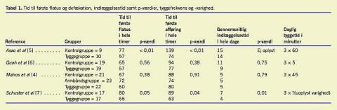Resultaterne af de fire studier er resumeret i Tabel 1. Asaoet al [5] fandt en signifikant forskel i tiden til første flatus (p < 0,01) og afføring (p < 0,01) samt en ikkesignifikant reduktion i indlæggelsestid på et døgn.