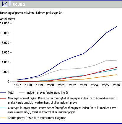 Materiale og metoder: Vi brugte data fra laboratoriedatabasen LABKA og fra Landspatientregisteret fra 1995 til 2006. Prøverekvirenten blev identificeret som almen praksis eller specialiseret sundhedsvæsen, hvorefter data blev sammenkørt via cpr-nummer. Herudover kategoriserede vi prøverne som incidente, gentagne normale, gentagne forhøjede eller kontroller .