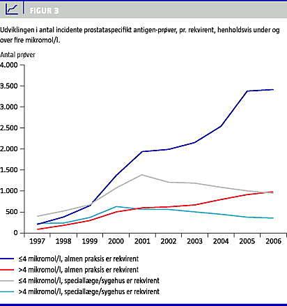 Resultater: Vi fandt, at antallet af PSA-prøver steg med en faktor 43 over perioden, og at andelen af prøver, der var rekvireret af almen praksis, steg fra 38,6% (95% sikkerhedsinterval (SI): 36,4-40,8%) i 1998 til 66,1% (65,4-66,8%) i 2006. Antallet af incidente prøver, der var rekvireret af almen praksis, og som havde et resultat på under fire mikromol/l, steg markant, mens det faldt i det specialiserede sundhedsvæsen fra 2001. Incidensen af CP i den undersøgte population steg i samme periode, men stabiliseredes fra 2004 og frem. Vi fandt desuden, at det gennemsnitlige antal prøver pr. undersøgt mand pr. år steg i almen praksis.