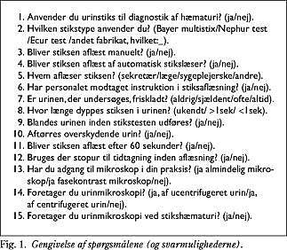 Resultater: Spørgeskemaerne blev besvaret af 132 ud af 143 praktiserende læger. Alle praktiserende læger brugte urinstiks ved diagnosticering af hæmaturi. Den praktiske anvendelse af urinstiks i almen praksis afveg hos 80% fra producentens brugsvejledning. Der var adgang til mikroskop hos 65% af de praktiserende læger, og 44% foretog mikroskopi ved stikshæmaturi.