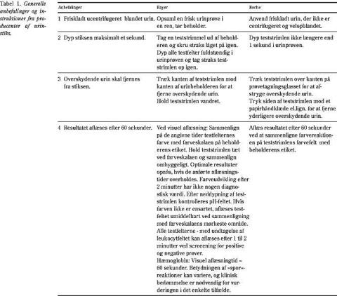 Der var en svarprocent på 92, idet 132 ud af 143 skemaer blev udfyldt og returneret. Alle praktiserende læger anvendte urinstiks ved diagnosticering af hæmaturi. Urinstiks fra firmaerne Bayer eller Roche blev brugt af 121 ud af 132 læger. Instruktionerne for brugen er i de væsentligste træk ensartede for disse to stiks (Tabel 1 ) (2, 3). Elleve læger havde enten ikke angivet navn på stiks eller brugte andre former for stiks, hvor instruktionerne afveg i større eller mindre grad.