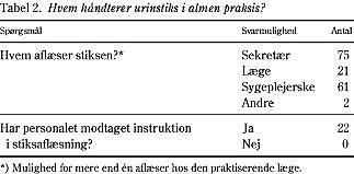 Der var flere forskellige faggrupper, der aflæste urinstiks i almen praksis (Tabel 2 ). Hos 12 praktiserende læger deltog lægen ikke selv i aflæsningen.