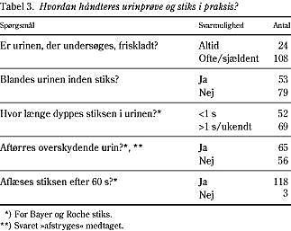 Selve håndteringen af urinstiks var ikke korrekt hos mange af de praktiserende læger. Således havde kun 24 ud af 121 (20%) en korrekt anvendelse af stiksen i forhold til producentens vejledning. Af disse brugte kun fem altid friskladt urin.