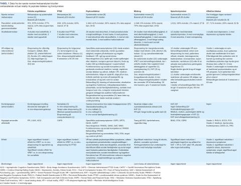 I den senest publicerede metaanalyse, hvor man evaluerede VRET til behandling af PTSD inkluderedes der ni studier (Tabel 1) [4]. Studierne inkluderede patienter med PTSD, som var relateret til krigstraumer, terrorangreb eller overfald. Forfatterne fandt en signifikant bedre behandlingseffekt af VRET end ventelistekontrol, men ingen signifikant forskel mellem VRET og aktiv kontrol [4].
