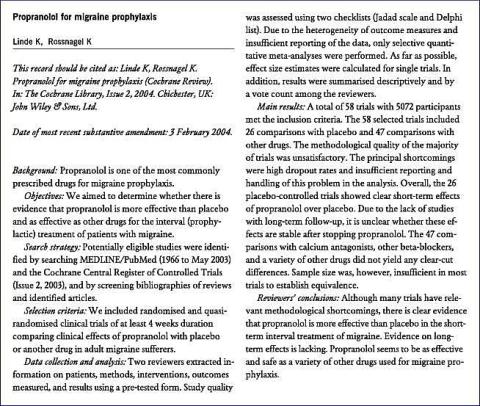 Et systematisk review af betablokkeren propranolol med den meget stringente metodik, der bruges i Cochrane-samarbejdet, er for nylig blevet publiceret i The Cochrane Library [4]. Selektionskriterierne var randomiserede eller quasirandomiserede, kontrollerede kliniske undersøgelser, hvori man sammenlignede effekten af propranolol med placebo eller anden medicin hos voksne migrænepatienter. De to forfattere noterede sig information om patienter, metoder, interventioner, undersøgelsesparametre og resultater. Undersøgelsernes kvalitet blev vurderet på tjeklister. På grund af undersøgelsesparametrenes heterogenitet og insufficiente oplysninger om resultaterne blev der kun foretaget en selektiv kvantitativ metaanalyse. I tillæg blev resultaterne opsummeret deskriptivt.