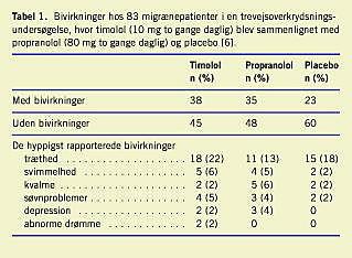 I den profylaktiske migrænebehandling er bivirkninger et betydeligt klinisk problem [9], men bivirkninger nævnes kun indirekte i forfatternes konklusioner i review' et om propranolol. I selve review' et er de selvfølgelig nævnt under de enkelte undersøgelser, men i de fleste undersøgelser var der ikke flere bivirkninger efter behandling med propranolol end efter placebobehandling. Grunden til dette er, at det oftest drejer sig om relativt små undersøgelser, hvor propranolol ikke havde flere bivirkninger end placebo. Bivirkningerne i en større overkrydsningsundersøgelse [6], hvor de to betablokkere timolol og propranolol havde signifikant flere bivirkninger end placebo, er vist i Tabel 1 . Træthed sås lige så hyppigt ved behandling med placebo som med de to betablokkere, mens svimmelhed, kvalme, søvnforstyrrelser, depression og abnorme drømme synes at optræde hyppigere ved behandling med timolol og propranolol. Dette svarer til, hvad man normalt finder i litteraturen.