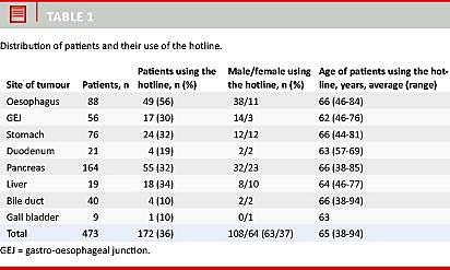 Indførelsen af en direkte hotline for cancerpatienter er stort set ikke beskrevet tidligere. Vi har vist, at det var muligt, og at den blev benyttet. Vi har også fået indsigt i, hvilke problemer de enkelte sygdomme medfører. Langt den hyppigste årsag til henvendelserne var uddybende spørgsmål, og de fleste af disse problemer kunne løses pr. telefon, hvorfor man på den måde har sparret både patienter og sundhedsvæsen for et vist antal besøg. Derudover fandt vi, at for øsofageal og gastroøsofageal cancer var det hyppigste problem dysfagi, hvilket i næsten alle tilfælde førte til endoskopi. Fordelen ved hotline i denne situation synes at være, at patienterne hurtigt kunne komme i kontakt med den fagperson, der var i stand til at løse problemet, uden først at skulle i kontakt med egen læge eller vagtlæge. Smerter var som nævnt det tredjehyppigste problem og i realiteten noget mindre end forventet. Det skyldes nok til dels, at egen læge håndterer mange af disse problemer. Dog blev hotline brugt til at justere patienternes medicin med, og man kunne overveje, om ikke det var en forholdsvis billig løsning på dette problem.
