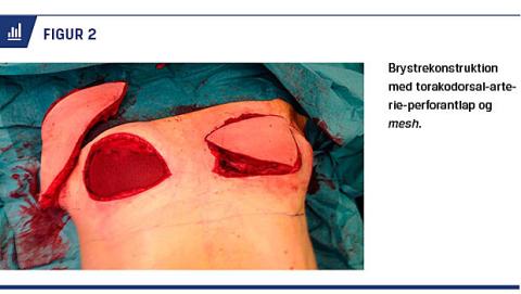 andet i kombination med en torakodorsal-arterie-perforantlap. Her tilvejebringes den manglende hud til brystrekonstruktionen fra ryggen. Hud og underhud rejses som en perforantlap og drejes som en propel rundt på forsiden af thorax, hvor den anvendes til brystrekonstruktionen [10]. Princippet er det samme som ved primær brystrekonstruktion, og metoden sikrer optimal placering af implantatet (Figur 2).