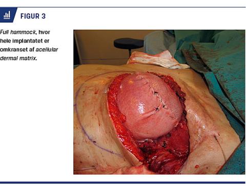 kan følgerne være så udtalte, at det er nødvendigt at placere implantatet foran den store brystmuskel. I disse udfordrende tilfælde kan der nu anvendes en full hammock-teknik, hvor hele brystimplantatet dækkes af ADM (Figur 3).