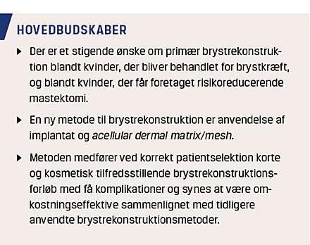 Brystrekonstruktion med implantat og ADM/mesh anvendes i stigende grad. Metoden synes at optimere det kosmetiske og funktionelle resultat efter implantatbaseret brystrekonstruktion. Det er dog fortsat uklart, hvilken virkning materialet har på komplikationsraten. Materialet synes at være bedst egnet til patienter uden risikofaktorer, som kunne disponere til postoperative komplikationer. Korrekt patientselektion er vigtig ved brystrekonstruktion med anvendelse af implantat og ADM/mesh. Metoden synes at være omkostningseffektiv sammenlignet med den konventionelle tostadieoperation uden anvendelse af ADM/mesh.