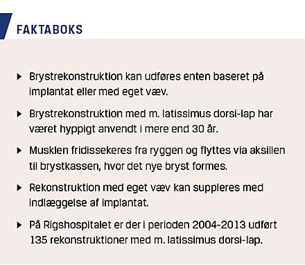 Efter operationen vil hovedparten få adjuverende kemo- og strålebehandling. I 2012 fik 97% af de mast-ektomerede patienter, der opfyldte Danish Breast Cancer Cooperative Groups kriterier, strålebehandling [3]. Mere end 80% af patienterne vil herefter være interesserede i at få rekonstrueret brystet [4]. Undersøgelser har vist, at rekonstruktion har en positiv effekt på patienternes evne til at komme sig over det psykologiske traume, der følger af den primære sygdom og behandling [5, 6]. Patienter, der ikke har fået strålebehandling, vil som regel få brystet rekonstrureret ved hjælp af et implantat. Derimod vil patienter, der har fået strålebehandling, i de fleste tilfælde få brystet rekonstrueret med anvendelse af eget væv.