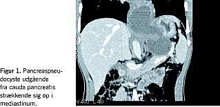 En 31-årig mand med erkendt alkoholinduceret kronisk pankreatitis blev indlagt med brystsmerter på en medicinsk afdeling. Han havde haft smerter i epigastriet gennem et par måneder, spist sparsomt på grund af dysfagi og havde haft et vægttab på 3 kg. Ved den kliniske undersøgelse var han akut smertepåvirket. Ved abdominal palpation, hjerte-lunge-stetoskopi, ekkokardiografi og elektrokardiogram blev der fundet normale forhold. Paraklinisk var myokardiespecifik kreatinkinase-, troponin T-, natrium-, kalium-, kreatinin-, alanin-aminotransferase-, basisk fosfatase- og bilirubinværdierne normale, men amylasen var forhøjet til 188 U/l (referenceinterval: 10-65 U/l). En røntgenundersøgelse af thorax viste normale forhold. En computertomografi (CT) af thorax og abdomen viste en mediastinal pseudocyste udgående fra cauda pancreatis (Figur 1 ). Cysten var afgrænset af en 2 cm tyk vævskapsel og strakte sig langs bagsiden af ventriklen op gennem diafragma, hvor den displacerede øsofagus fortil i thorax. I pancreas sås forkalkninger. Der var ingen dilatation eller sten i galdevejene/galdeblæren. På grund af vanskelige adgangsforhold til cysten valgte man drænage paravertebralt med anlæggelse af et pigtail -kateter, hvorfra der blev udtømt 250 ml mørk væske. Ved analyse af denne blev der målt et amylaseindhold på 25.420 U/l. Ved en ultralydskontrol fire dage senere blev der fundet regression af cysten, og patienten blev udskrevet til ambulant endoskopisk retrograd pankreatikografi (ERP). Han udeblev imidlertid fra dette fire gange, hvorfor drænet først blev fjernet efter fem uger. Ved en ultralydskontrol seks uger efter primær drænanlæggelse blev der fundet fuldstændig regression af cysten. Behandlingen blev herefter afsluttet.