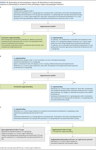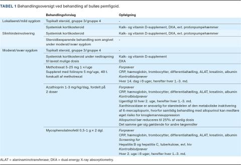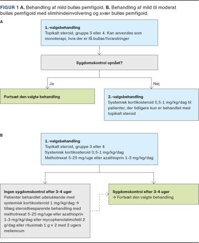 Det overordnede formål er at opnå sygdomskontrol, hvilket indebærer at dæmpe sygdomsaktiviteten og forhindre cikatricedannelse ved slimhindeinvolvering. Herudover tilstræbes bedst mulige livskvalitet med fokus på lindring af hudkløe og forebyggelse af infektioner, indtil der opnås sygdomsremission. Behandlingen er individuel, afhænger af sværhedsgraden, hvor store hudområder der er involveret, og om der ud over affektion af huden er slimhindeinvolvering. Ved affektion af et mindre hudområde er det ofte tilstrækkeligt at behandle med topikale steroider (Figur 1A). I de tilfælde, hvor topikale steroider ikke er tilstrækkeligt, eller større hudområder er involveret, tillægges der behandling med systemisk kortikosteroid. Da langtidsbehandling med systemisk kortikosteroid er forbundet med bivirkninger og overdødelighed, bør der ved første konsultation tages stilling til steroidbesparende behandling (Figur 1A). Behandlingen med systemisk kortikosteroid nedtrappes langsomt, samtidig med at steroidbesparende behandling med f.eks. methotrexat (MTX) eller azathioprin iværksættes. Der foreligger ikke tilstrækkelig evidens for at rangordne præparaterne, hvorfor valg af behandling beror på den behandlende læge og den specifikke patient. Ved utilstrækkelig effekt eller i de tilfælde, hvor systemisk kortikosteroid, MTX eller azathioprin er kontraindiceret, iværksættes anden steroidbesparende behandling (Figur 1B, Tabel 1). Ved slimhindeinvolvering bør der initieres behandling med systemisk kortikosteroid for at opnå hurtig remission, og behandling med MTX, mycophenolatmofetil (MMF) eller rituximab (RTX) skal iværksættes. Ved manglende hurtig effekt kan behandlingen suppleres med plasmaferese f.eks. 3 × ugtl. i 2-3 uger, indtil der foreligger svar på forprøver til behandling med RTX (Figur 1B). Patienter med talrige bullae på mere end 15% af hudorganet og/eller slimhindeinvolvering bør indlægges til intensiveret og relevant sårbehandling.