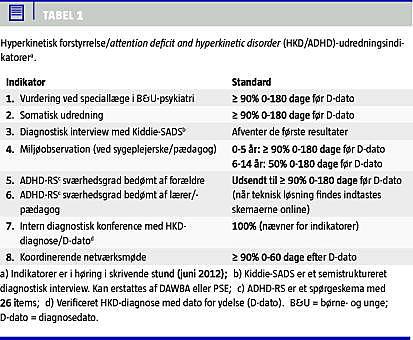 Indikatorer er udvalgt på baggrund af den eksisterende litteratur og faglig konsensus på området [3]. Indikatorer og standarder for »den gode udredning" (Tabel 1 ) implementeres i 2013, og i næste fase (2014) udarbejdes og implementeres behandlingsindikatorer.