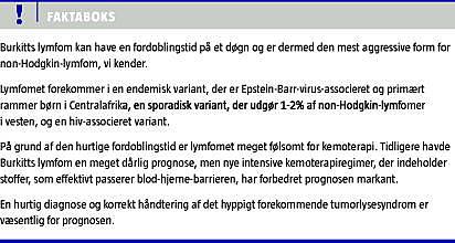 Burkitts lymfom (BL) er et højmalignt lymfom af B-celle-fænotype og udgør i den vestlige verden 1-2% af non-Hodgkin-lymfomerne (NHL) hos voksne [1]. Tumoren blev første gang beskrevet af Dennis P. Burkitt i 1958 som et sarkom i kæben hos afrikanske børn [2]. Sygdommen har ubehandlet et særdeles aggressivt forløb, og der er beskrevet fordoblingstid af tumoren på 24 timer. Pga. dette har de fleste patienter en kort sygdomsanamnese og på diagnosetidspunktet ofte stor tumorbyrde og moderat til svært forhøjet P-laktatdehydrogenase (LDH) og hyperurikæmi. Klinisk inddeles BL i tre epidemiologiske varianter: endemisk, sporadisk og immundefektrelateret (aids-relateret). I det følgende beskrives den kliniske fremtræden, differentialdiagnostiske overvejelser og nyere behandlingsmuligheder ved BL, hvor vigtigheden af centralnervesystem (CNS)-profylakse vil blive omtalt.