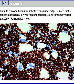 Immunfænotypisk udtrykker BL markører for B-lymfocytter og B-celle-lymfom (Bcl) 6 samt CD 10 [3]. I modsætning til andre B-celle-lymfomer er tumorcellerne oftest negative for Bcl2 og kan bl.a. differentieres fra akut lymfatisk leukæmi ved, at de ikke udtrykker terminal deoxynukleotidyltransferase. Meget karakteristisk for BL, uafhængig af morfologi, er, at næsten 100% af tumorcellerne udtrykker proliferationsmarkøren Ki-67 (MIB-1) (Figur 3 ). Udtrykker tumorcellerne Bcl2, skal de øvrige karakteristiske træk ved BL være til stede, for at diagnosen kan stilles [3].