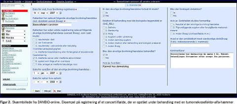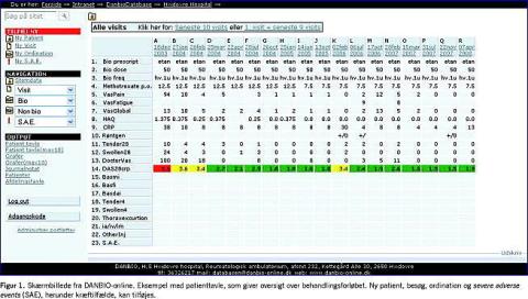 I forlængelse af anbefalingerne i en medicinsk teknologivurdering om diagnostik og behandling af RA har danske reumatologer siden oktober 2000 frivilligt registreret reumatologiske patienter i TNF-alfa-hæmmende behandling i databasen DANBIO. Der indrapporteres fra alle landets reumatologiske afdelinger, og patienterne følges principielt i databasen livslangt. Hospitalsafdelingerne har siden januar 2006 kunnet indrapportere online [15]. Databasen er opgjort til at have en dækningsgrad på 92% i 2007 [16]. I DANBIO registreres følgende stamdata: CPR-nummer, højde, vægt, diagnose, dato for diagnose, dato for start på symptomer og tidligere behandling med disease-modifying anti-rheumatic drugs (DMARDs). Ved start på TNF-alfa-hæmmende behandling og ved kontrolbesøg registreres longitudinelt: TNF-alfa-hæmmer, dosis, evt. behandling med DMARDs, binyrebarkhormon og smertestillende præparater, biomarkører, funktionsevne i hverdagen ved health assessment questionnaire (HAQ) og sygdomsaktivitet, røntgenstatus mm. Sygdomsaktivitet vurderes og beregnes som disease activity score (DAS28) = 0,56 * kvadratrod (antal ømme led ud af 28) + 0,28 × kvadratrod (antal hævede led ud af 28) + 0,36 × ln(C-reaktivt protein + 1) + 0,014 × visuel analog skala (VAS) global + 0,96. Figur 1 viser et skærmbillede med en patienttavle fra DANBIO-online, som giver oversigt over patientforløbet. Endvidere registreres prospektivt alvorlige og ikkealvorlige bivirkninger, herunder cancertilfælde som opstår under behandlingen (Figur 2 ).