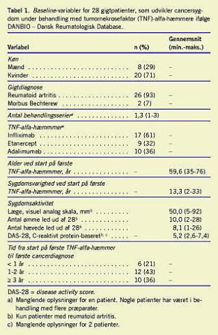 Den kumulerede behandlingsvarighed med biologiske lægemidler hos de 3.688 gigtpatienter var 6.092 år (infliximab 2.733 år, etanercept 1.774 år, adalimumab 1.585 år). Der var registreret 30 cancertilfælde hos 28 patienter i DANBIO efter behandlingsstart. Alle 30 indrapporterede cancerdiagnoser blev bekræftet ved journalgennemgang. Demografiske og sygdomsrelaterede oplysninger om de 28 patienter ved behandlingsstart kan ses i Tabel 1 . Seks mænd og 20 kvinder havde RA og to mænd havde Morbus Bechterew. Flest patienter havde været i behandling med infliximab, som blev markedsført først. Blandt de 27 patienter med komplette behandlingsoplysninger havde 19 været i behandling med én TNF-alfa-hæmmer, syv havde været i behandling med to, og en patient havde prøvet alle tre præparater. De behandlende læger scorede patienternes globale sygdomsaktivitet til 50 mm i gennemsnit på en visuel analog skala (VAS) på 100 mm. Det gennemsnitlige antal hævede og ømme led var ti og otte (ved en 28-leds score) ved behandlingsstart, hvilket reflekteres i en høj gennemsnitlig sygdomsaktivitetsscore (DAS28) på 5,2 (min.: 2,6 maks. 7,4. DAS28 = 5 ,2 afspejler høj sygdomsaktivitet og DAS28 < 3,2 lav aktivitet).
