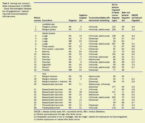 Resultater: Der var 30 rapporterede cancertilfælde efter start på TNF-alfa-hæmmende behandling hos 28 ud af de 3.688 gigtpatienter, der var registreret i DANBIO fra oktober 2000 til juni 2007. Følgende cancertyper var rapporteret: malignt lymfom n = 2 (7%), lunge n = 4 (13%), plicae vocalis n = 2 (7%), mamma n = 4 (13%), pancreas n = 3 (10%), kolorektal n = 2 (7%), prostata n = 1 (3%), malignt melanom n = 3 (10%) og nonmelanom hudcancer n = 9 (30%).