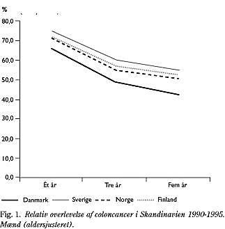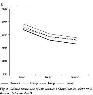 For cancer coli som helhed er femårsoverlevelsen i Danmark ca. 30% (crude survival ). Dette er ca. 10% dårligere end i de øvrige nordiske lande. Årsagssammenhængen er uafklaret, men formentlig multifaktoriel.