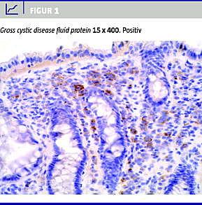 Colonbiopsierne viste tumorceller med negativ reaktion for CK 20, CDX-2, E-cadherin og TTF-1, og det udelukkede med størst mulig sandsynlighed, at det kunne dreje sig om enten primær colon- eller lungecancer. Positive reaktioner for østrogen- og progesteronreceptor samt gross cystic disease fluid protein 15 (GCDFP-15) (Figur 1 ) sandsynliggjorde diagnosen primær cancer mammae, mens negativ E-cadherin pegede på lobulært mammakarcinom.