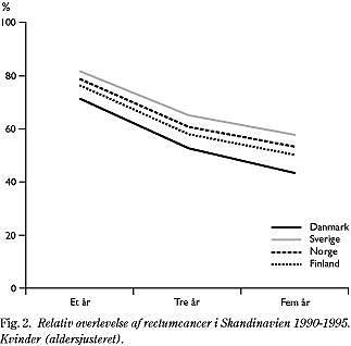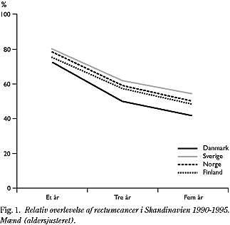 Prognosen for patienter med cancer recti afhænger først og fremmest af sygdomsudbredelsen på diagnosetidspunktet, men en række histopatologiske karakteristika, herunder differentieringsgrad og karinvasion spiller også en rolle. For sygdomsgruppen som helhed er 5-års-overlevelsen ca. 30% (crude survival ). I Danmark anvendes samme system (Dukes) som ved cancer coli. Patienter med Dukes' A tumor (lokaliseret til tarmvæggen) udgør ca. 15% af patienterne og har en 5-års-overlevelse på ca. 75%. Patienter med gennemvækst af tarmvæggen (Dukes' B) udgør ca. 30% af patienterne, og 5-års-overlevelsen er ca. 50%. Ca. 30% af patienterne vil have spredning til lymfeknuderne (Dukes' C). Femårsoverlevelsen for disse er ca. 25%. På diagnosetidspunktet vil ca. 15% af patienterne (Dukes' D) have dissemineret sygdom, og ingen af disse er i live efter fem år. Alt i alt er overlevelsen, som ved cancer coli, kortere i Danmark sammenlignet med vore nordiske nabolande (Fig. 1 og Fig. 2 ).