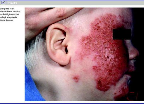 Atopisk dermatitis (børneeksem) opstår hos ca. en femtedel af danske børn [1, 2]. Sygdommen debuterer tidligt og forsvinder hos to tredjedele af patienterne inden teenagealderen [3]. Symptomerne er tør hud og kronisk eller tilbagevendende kløende, rødt let skællende udslæt i ansigtet, samt på halsen, kroppen og i bøjefurer af albuer og knæ. Hos lidt ældre børn udvikles hos ca. en tredjedel allergier over for pollen, dyrehår, husstøvmider og skimmelsvampe, men disse allergier betragtes som epifænomener ved sygdommen og har ikke kausal sammenhæng [4].