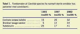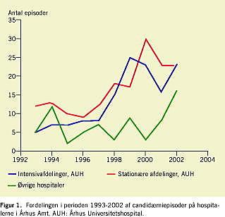 Resultater: I perioden 1993-2002 har andelen af positive bloddyrkninger fra Århus Amts hospitaler været konstant, mens den relative forekomst af positive bloddyrkninger med Candida species er steget fra 1,8% til 3,4% og i særlig grad blandt patienter på AUH. I perioden er der i tiltagende omfang blevet påvist vækst af Candida species fra udvalgte, normalt sterile områder, ligesom andelen af Candida »nonalbicans«-species i forhold til C. albicans er steget. Forbruget af antibakterielle midler er steget markant, især hvad angår cefalosporiner og quinoloner, og mest udtalt på intensivafdelinger.