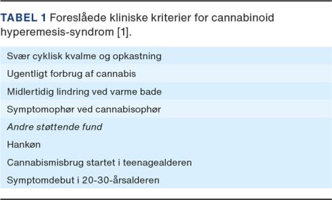 Cannabinoid hyperemesis-syndrom (CHS) er kendetegnet ved kvalme og cykliske opkastninger. Syndromet lindres ved varme bade og skyldes kronisk cannabismisbrug (Tabel 1). CHS er en underdiagnosticeret tilstand, som har været kendt siden 2004 [1]. Omkring 1% af de 16-64-årige i Danmark har et næsten dagligt cannabismisbrug og er dermed i risiko for at udvikle CHS [2]. Brug af cannabidiol (CBD)-olie har også været associeret med CHS [3]. Vi præsenterer en sygehistorie med en ung kvinde med cannabismisbrug og CHS.