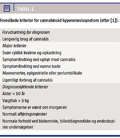 Cannabinoid hyperemesissyndrom (CHS) er et syndrom, hvor patienter med kronisk cannabismisbrug har cykliske opkastninger, kvalme og mavesmerter, og hvor symptomerne lindres ved varme bade (Tabel 1). CHS blev første gang beskrevet i 2004 hos ni patienter i Australien [2]. Der er siden publiceret flere kasuistikker om syndromet, herunder et enkelt dansk tilfælde [3], og i 2012 publicerede Mayo Klinikken et review med 98 sygehistorier [1]. Det er vigtigt at kende til syndromets klassiske symptomer, så man kan identificere sammenhængen med cannabismisbruget og derved kan spare patienten for et langvarigt udredningsforløb. Vi præsenterer her tre sygehistorier med unge mænd, der alle havde klassiske symptomer på CHS.