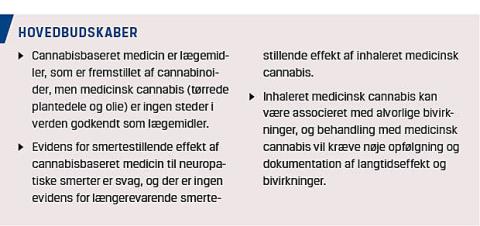 I metaanalyser har man dokumenteret, at den analgetiske effekt af cannabisbaserede produkter er tvivlsom og i bedste fald beskeden [7]. Trods dette har mange patienter et ønske om lægeordineret cannabis til behandling af bl.a. kroniske smertetilstande. Dette ønske har fået betydelig omtale i medierne og politisk støtte fra et flertal blandt Folketingets partier. Der er derfor indført en fireårig forsøgsordning, der startede den 1. januar 2018, hvor patienter, herunder patienter med smertetilstande, inden for fire områder skal kunne behandles med lægeordineret medicinsk cannabis.