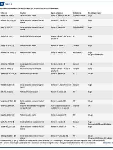 Denne artikel er en narrativ gennemgang af publicerede studier, hvor man med placebo som kontrol har undersøgt den analgetiske effekt af cannabinoider til behandling af patienter med neuropatiske smerter.