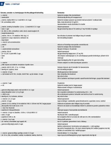 Af de fire studier af nabiximols viste kun det ene en smertereduktion på omkring 10 mm på en VAS-skala (0-100 mm) efter fem ugers behandling [15]. I de øvrige tre studier fandt man ikke en smertereduktion ved brug af nabiximols efter hhv. to, fire, ti og 14 ugers behandling [14, 18, 19]. Der blev rapporteret om bedre søvnkvalitet i to studier, men samtidig også om forekomst af psykiske bivirkninger hos 28% af de patienter, der var behandlet med nabiximols, versus 9% af de patienter, der var behandlet med placebo, i det største af studierne med 246 patienter [19]. Dette studie havde en dropoutrate på 38% i nabiximolsgruppen, hvilket må tilskrives bivirkninger af denne behandling. De to største studier af nabiximols var initieret og sponseret af producenten [15, 19].