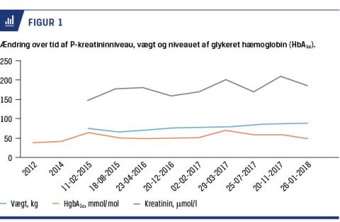 En 72-årig kvinde blev indlagt med recidiv af diabetes. Hun havde tidligere fået foretaget kolecystektomi, havde svær adipositas og tabletbehandlet type 2-diabetes mellitus (T2DM). I 1985 fik hun en gastrisk bypass, som medførte, at hendes T2DM forsvandt. Al antidiabetisk medicin blev efterfølgende seponeret. Flere år efter fik hun progredierende nefropati. En nyrebiopsi viste oksaloseforandringer, hvilket er en kendt komplikation i forbindelse med gastrisk bypass. Man påbegyndte derefter dialysebehandling. Fire år efter blev hun nyretransplanteret. I forbindelse med den rutinemæssige påbegyndelse af prednisolonbehandling havde hun kortvarigt behov for insulin. Under prednisolonudtrapningen ophørte insulinbehandlingen, og hun opnåede normalt niveau af glykeret hæmoglobin (HbA1c) uden antidiabetisk medicin. Graftfunktionen stabiliseredes med et P-kreatininniveau på 150 μmol/l. I løbet af 2015 fik hun svære ryg- og mavesmerter. Ved udredningen fandt man osteoporotiske sammenfald og adhærenssmerter efter tidligere abdominaloperationer. Man igangsatte uden tilstrækkelig effekt behandling med fentanylplaster og paracetamol. Hun blev henvist til smerteklinikken, hvor der blev påbegyndt behandling med cannabisdråber, dronabinol. Kort tid efter blev der ved en rutinekontrol i nefrologisk ambulatorium påvist tegn på diabetes med et HbA1c-niveau på 69 mmol/mol (mod 48 mmol/mol et år tidligere). Der var tilkommet vægtøgning (Figur 1). Hun beskrev øget appetit i forbindelse med dronabinolbehandlingen. Hun blev indlagt og fik injektion med insulin glargin 12 IE og insulin aspart efter behov.