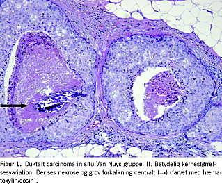 Histopatologisk findes der flere varianter af DCIS, som beskrives i henhold til vækstmønster, kernemorfologi, kerneatypi og tilstedeværelse af nekrose. I Danmark anvendes Van Nuys klassifikationssystem til malignitetsgradering. Metoden er reproducerbar og har en signifikant prognostisk betydning [4]. Den er baseret på en vurdering af kerneatypi og nekrose: gruppe I, II og III. Gruppe III har store pleomorfe nucleoleholdige kerner og hyppige nekroser (Figur 1). Gruppe III har en større recidivrisiko end gruppe I, som har beskeden kerneatypi og ingen forekomst af nekrose.