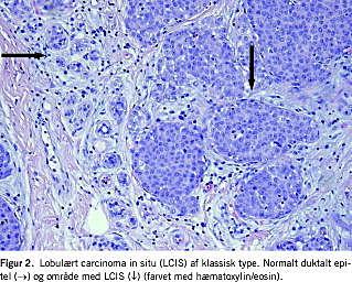 I mange år har man opfattet LCIS »bare« som en risikofaktor for senere udvikling af brystkræft. Igennem de senere år er der tiltagende evidens for, at LCIS bør opfattes som et reelt forstadie til invasivt lobulært karcinom. Der er således påvist genetisk klonalitet med enslignende genetiske forandringer i parrede læsioner bestående af LCIS og invasivt lobulært karcinom. Ligeledes er det påvist, at risikoen for, at der udvikles invasivt karcinom, er 3-5 gange større i det ipsilaterale bryst end i det kontralaterale bryst [3]. Ved LCIS vil 12-37% af kvinderne udvikle invasivt karcinom inden for 15-47 år.