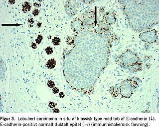 Pleomorf LCIS (PLCIS) er en sjælden variant af LCIS [5]. Det er differentialdiagnostisk vanskeligt at adskille PLCIS fra DCIS, idet PLCIS som nogle varianter af DCIS har store pleomorfe og nukleoleholdige kerner. Der kan som ved DCIS ses centrale nekroser af såkaldt komedotype. Ved hjælp af immunhistokemisk undersøgelse for adhæsionsmolekylet E-cadherin ses imidlertid blank negativ reaktion i både klassisk LCIS (Figur 3 ) og PLCIS, mens der ses positiv reaktion i DCIS. Klassisk LCIS udtrykker normalt ikke amplifikation af vækstfaktoren human epidermal growth factor receptor 2 (HER2) i modsætning til PLCIS, som kan udvise HER2-overekspression. Dette understøtter ligeledes antagelsen af PLCIS som en mere aggressiv læsion end klassisk LCIS.