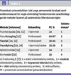 Da caries er en bakterielt induceret sygdom, kan sygdommen kontrolleres ved mekanisk fjernelse af mikroorganismerne eksempelvis ved tandbørstning. Videnskabeligt set er der dog manglende evidens for, at god mundhygiejne skulle hindre caries, og det skyldes, at randomiserede kliniske undersøgelser ikke kan udføres med hensyn til mundhygiejne. Derimod har man i flere systematiske litteraturoversigter konkluderet, at der findes betydelig videnskabelig støtte for, at fluorid hæmmer cariesudviklingen (Tabel 1 , [10-14]). Tidligere havde man den opfattelse, at fluorid skulle indbygges i emaljen under emaljens dannelse. I dag ved man, at fluorid har en stabiliserende virkning på mikrofloraen, modvirker demineralisering og understøtter remineralisering ved at være til stede i saliva og i plakvæsken - fluorid har altså en lokal effekt. Der kræves meget lave koncentrationer af fluor (0,08 ppm) i det orale miljø for at påvirke cariesbalancen. Diffusionen gennem en fortykket biofilm er dog langsom. Derfor er det hensigtsmæssigt, at administrationen af fluorid kombineres med mekanisk rengøring. Tandbørstning med fluortandpasta to gange om dagen er den mest omkostningseffektive måde at forebygge caries på. Effekten er dosisrelateret, og den procentuelle cariesreduktionen er 4-8% højere, når der anvendes tandpasta med 1.450 ppm fluorid (F) sammenlignet med »standardtandpasta« med 1.000 ppm F. Tandpasta med 5.000 ppm F kan i Danmark ordineres på recept. Mængden af fluorid skal altid vejes op mod risikoen for bivirkninger i form af dental fluorose. Specielt skal mængden af fluortandpasta begrænses de første seks leveår, hvor tandkronerne dannes.