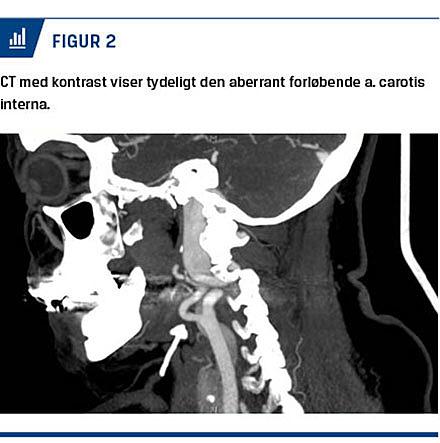 På mistanke om en arteriel malformation blev der udført CT med kontrast (Figur 2). Denne viste en slynget, moderat dilateret a. carotis interna, beliggende posteriort for svælget. Der var ingen tegn til aneurisme.