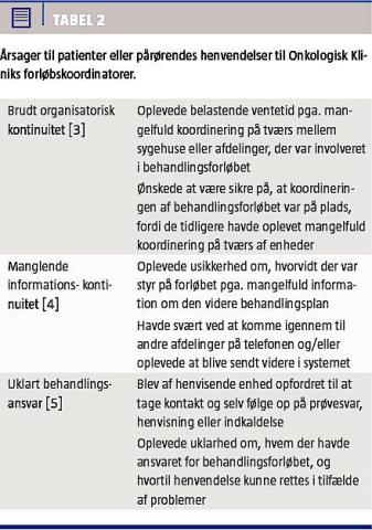 Her fremgik en række mulige årsager til patienters eller pårørendes konkrete henvendelse til Onkologisk Kliniks forløbskoordinatorer (Tabel 2). Behovet for koordinering og information om det videre forløb var gennemgående. Patienter og pårørende oplevede generelt, at forløbskoordinatorerne formidlede det, de efterspurgte, og det blev fremhævet som positivt, at koordinatorerne var lettilgængelige over telefonen og tog ansvar for at få løst patientens eller den pårørendes aktuelle problem.