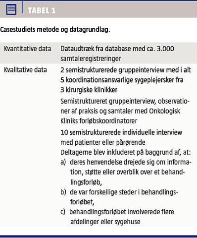 Casestudiet blev gennemført af Kræftens Bekæmpelse i januar-februar 2013 i tæt samarbejde med Onkologisk Kliniks ledelse og forløbskoordinatorer [2]. Onkologisk Kliniks fire forløbskoordinatorer er sygeplejersker og primært et fagligt kontakttilbud til patienter, der er henvist til klinikken, deres pårørende og sundhedsprofessionelle. De er også involveret i tværfagligt og tværgående kvalitetsudviklingsarbejde med særligt fokus på den organisatoriske og patientcentrerede kvalitet, dog uden en fællessynlig systematik i forhold til samtlige kræftpakkeforløb. Udvalgte opgaver i forløbskoordinatorfunktionen blev fra april 2011 til oktober 2012 dokumenteret i en database med ca. 3.000 samtaleregistreringer af ad hoc-henvendelser fra patienter, pårørende og sundhedsprofessionelle. I casestudiet beskrives forhold gældende for patienter, der var henvist til eller var i aktive behandlingsforløb på Onkologisk Klinik, og der kan ikke generaliseres på baggrund af dem.