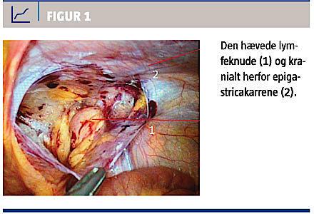 et fastsiddende femoralhernie med tarmindhold. Samme dag blev der foretaget laparoskopi, hvor man ikke fandt tegn på femoralhernie, men derimod forstørrede lymfeknuder omkring epigastrica- og femoralkarrene (Figur 1). En forstørret højresidig ingvinal lymfeknude blev excideret og sendt til patologisk undersøgelse.