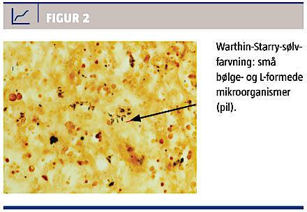 Det histologiske svar viste voldsom lymfoid hyperplasi med fokalt bevarede kimcentre. I områder var der nekroser, som dannede landkort- og guirlandeformede mønstre, og i en bræmme omkring disse sås histiocytære celler. Ved histokemisk sølvfarvning med Warthin-Starry fandt man fokalt små bølgeformede og L-formede mikroorganismer i relation til nekroserne (Figur 2). Det histologiske fund og specialfarvningen sandsynliggjorde diagnosen B.‑henselae-infektion, og patienten blev på mistanke om CSD sat i behandling med azithromycin. Ved yderligere anamneseoptagelse oplyste familien, at de havde kat i hjemmet. Ved en efterfølgende serologisk undersøgelse bekræftedes diagnosen, og da moderen blev informeret om denne, erindrede hun, at sønnen tidligere havde haft et lille sår på stedet, hvor lymfeknudehævelsen var blevet observeret. Det vides ikke, om patientens sår var betinget af bid eller krads af familiens kat, men et slik på såret er tilstrækkeligt til at blive smittet med bakterien [1].