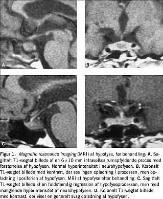 I. En 55-årig kvinde havde i to måneder haft almensymptomer, sinuitis, rinitis med skorpedannelse, epistaxis, hæmoptyse, episkleritis og polyuri (7,2 l pr. døgn). Ved en næseslimhindebiopsi sås der kronisk inflammation og Pr3-antineutrofile cytoplasmatiske antistoffer (ANCA) var positiv (>100 enheder pr. ml). En tørsteprøve viste partiel CDI. Adenohypofysefunktionen var normal. Ved en magnetic resonance imaging (MRI) (Figur 1) sås der diffust forstørret hypofyse med en kontrastfattig intrasellær rumopfyldende proces. Neurohypofysen viste normal hyperintensitet på T1-vægtede billeder. En somatostatinreceptorskintigrafi (SRS) viste øget aktivitet svarende til cavum nasi, men et upåfaldende hypofyseleje. Patienten responderede på behandling med højdosis prednisolon, methotrexat og desmopressin. MRI af hypofysen efter to år viste komplet regression af hypofyselæsionen, men en manglende hyperintensitet af neurohypofysen. Den medikamentelle behandling forblev uændret.