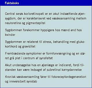 Central serøs korioretinopati er relativt let at diagnosticere med fornødent kendskab til alle sygdommens faser og adgang til OCT som redskab til detektion af subretinale væskeansamlinger, der kan være vanskelige at se ved spaltelampebiomikroskopi. Behandling med binyrebarkhormon eller endogen hyperkorticisme er vigtige årsager til CSC. Denne sammenhæng bør kendes af alle læger, skønt den ikke er nævnt i de relevante lægemidlers officielle produktresume (teksten på indlægssedlerne) eller i Lægemiddelkataloget. Læger, som ordinerer behandling med glukokortikoid, også som inhalationssteroid, skal være opmærksomme på, at behandlingen undertiden medfører udvikling af CSC.