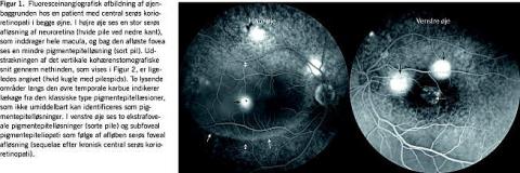Central serøs korioretinopati (CSC) er en akut indsættende, undertiden asymptomatisk og kronisk forløbende øjensygdom, der er karakteriseret ved ophobning af klar væske mellem neuroretina og retinas pigmentepitel (Figur 1 ) [1]. Væskeansamlingen ses i relation til svær fokal angiografisk lækage af fluorescein, en markørsubstans, der vidtgående følger bevægelsen af vand gennem pigmentepitelet ind i lakunen mellem dette og den afløste neuroretina.