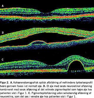 Typisk ved et nyligt udviklet førstegangstilfælde af CSC er en prominerende bulløs afløsning af nethinden med klar væske foran pigmentepitelet, begrænset til øjets bagerste pol (Figur 1 og Figur 2). Fluoresceinangiografi viser en enkelt eller nogle få læsioner med ekspanderende lækage. Oftalmoskopisk ses der ofte en grynet aflejring bag nethinden [8].